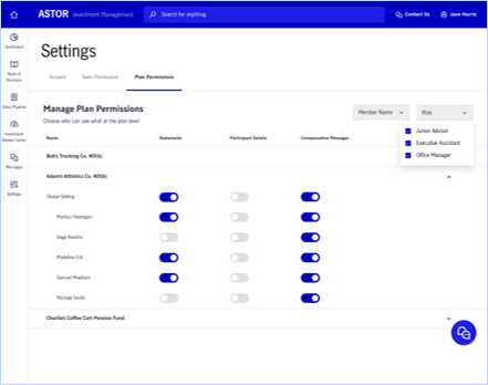 An advisor often times has a lot of projects and with that will have a team that they manage as well. In the Settings section of the website an advisor is able to manage which team members are able to see which projects, and on a more minute level, determine what part of a project that team member can see. This helps an advisor maintain customer privacy and security while ensuring that they have the help they need to get the job done. This was the most pivotal part of the setting experience that I designed, which the other functionality centered on updating their individual profile.